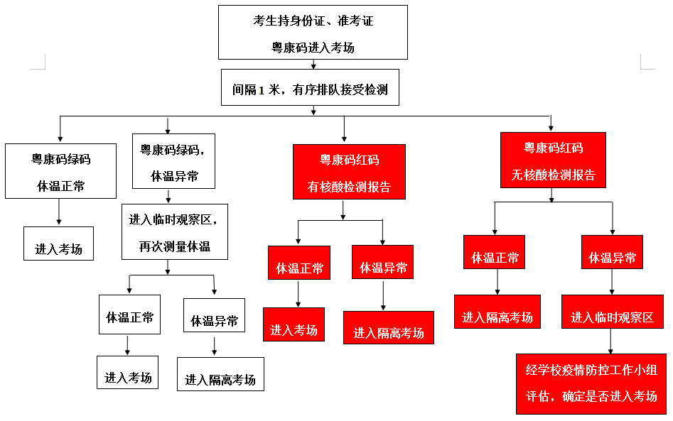 所有考生考前14天(5月31日)起,须按要求进行考前连续14天的个人健康情况及活动轨迹申报,并注册粤康码。未注册“粤康码”的考生不予打印准考证,不得参加考试。考前14天出现发热、干咳、乏力、鼻塞、流涕、咽痛、腹泻等疑似症状(简称疑似症状,下同)、从中高风险地区返回或粤康码为红码的考生,须提供考前7天核酸检测阴性证明,方可参加考试。尚在外地的考生应了解考点所在地疫情防控相关要求,及时返回,并按属地化要求和规定进行管理,以免耽误考试。根据我省卫生防疫相关规定,从境外或高风险地区返粤及“粤康码”红码的人员,须按当地要求先隔离14天。