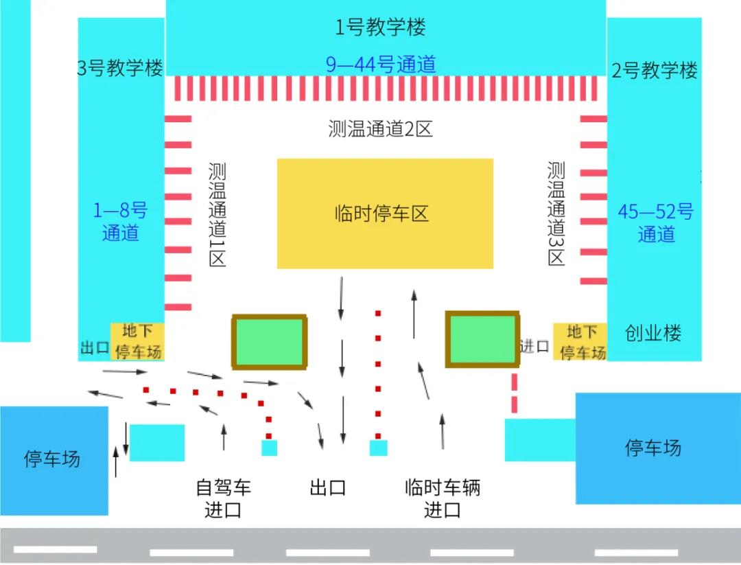 6、从北门进入校园的考生,临时车辆可从临时车辆通道进入校园,停在北门广场的临时停车区,考生下车后,车辆驶出校园。考生自驾车辆可从考生自驾车辆通道进入校园,按照保安指引将车辆停放在指定停车区域。